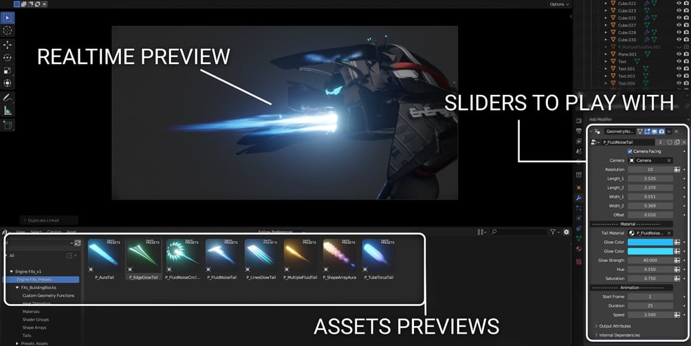 Even if you're not familiar with Blender's powerful procedural mesh generation tool, Geometry Nodes, you can easily use this asset pack to create awesome-looking engine burst effects.